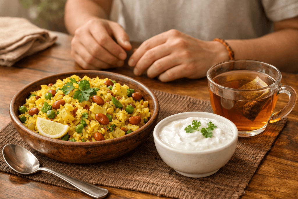 A good breakfast should include protein, fibre, and some fat. Vegetable poha with peanuts, paneer or tofu paratha with curd, vegetable omelette, idli with extra sambar, or even leftover dal and roti are all perfectly fine. There is no perfect breakfast. There is only a balanced one.
