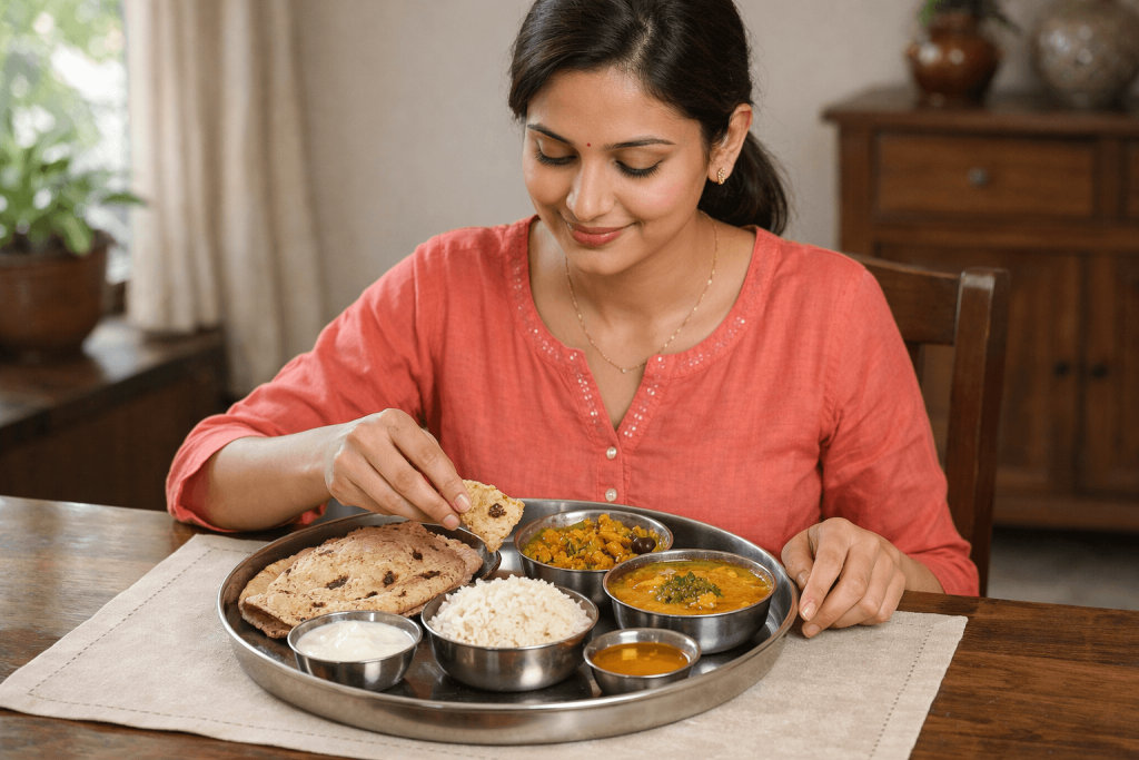 A simple Indian thali works best. Roti or rice, a protein like dal, rajma, chole, paneer or curd, seasonal vegetables, and a little ghee or oil. Eat calmly, without screens. Digestion begins when the mind feels relaxed.