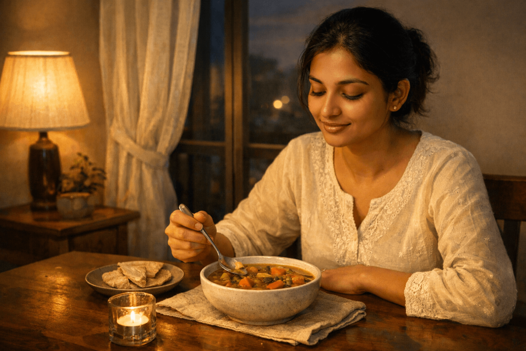 Vegetable soups with paneer, khichdi with vegetables and ghee, sautéed sabzi with one roti, or curd-based meals suit most people. Finish dinner at least two to three hours before bedtime.