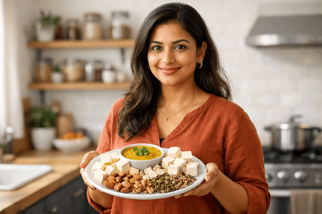 Vegetarian sources include dals, legumes, paneer, curd, milk, tofu, nuts, and seeds. Non-vegetarians can add eggs, fish, or lean meat. Every meal should have a clear protein source.